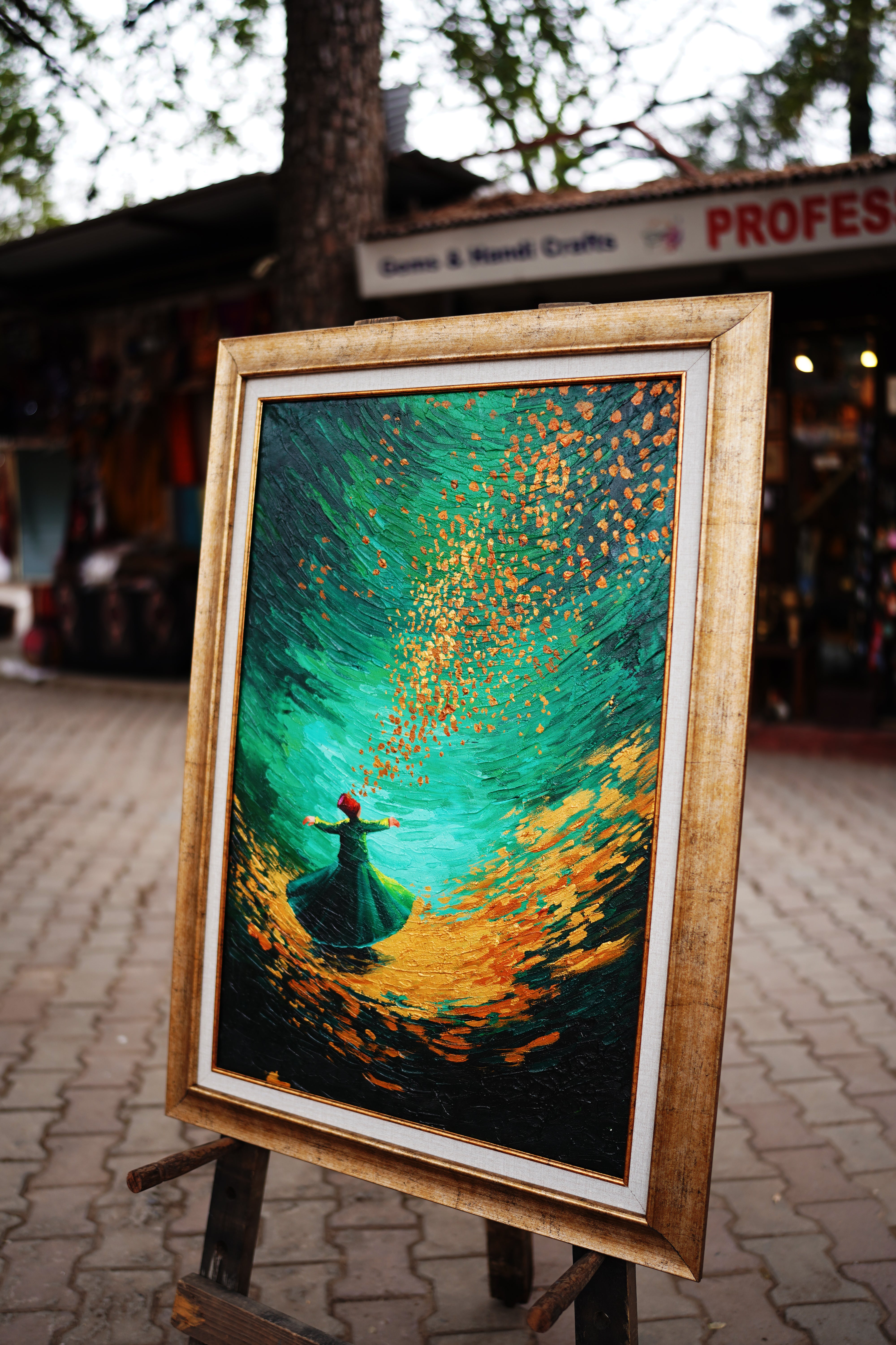 Embark on a visual journey of tranquility and divine enlightenment with this breathtaking hand-painted masterpiece from Professor’s Gallery. This unique piece depicts a Whirling Dervish in deep teal robes, centered within a swirling vortex of lush emerald greens and radiant gold-leaf textures. The upward motion of the golden light represents the soul’s ascent toward divine truth.