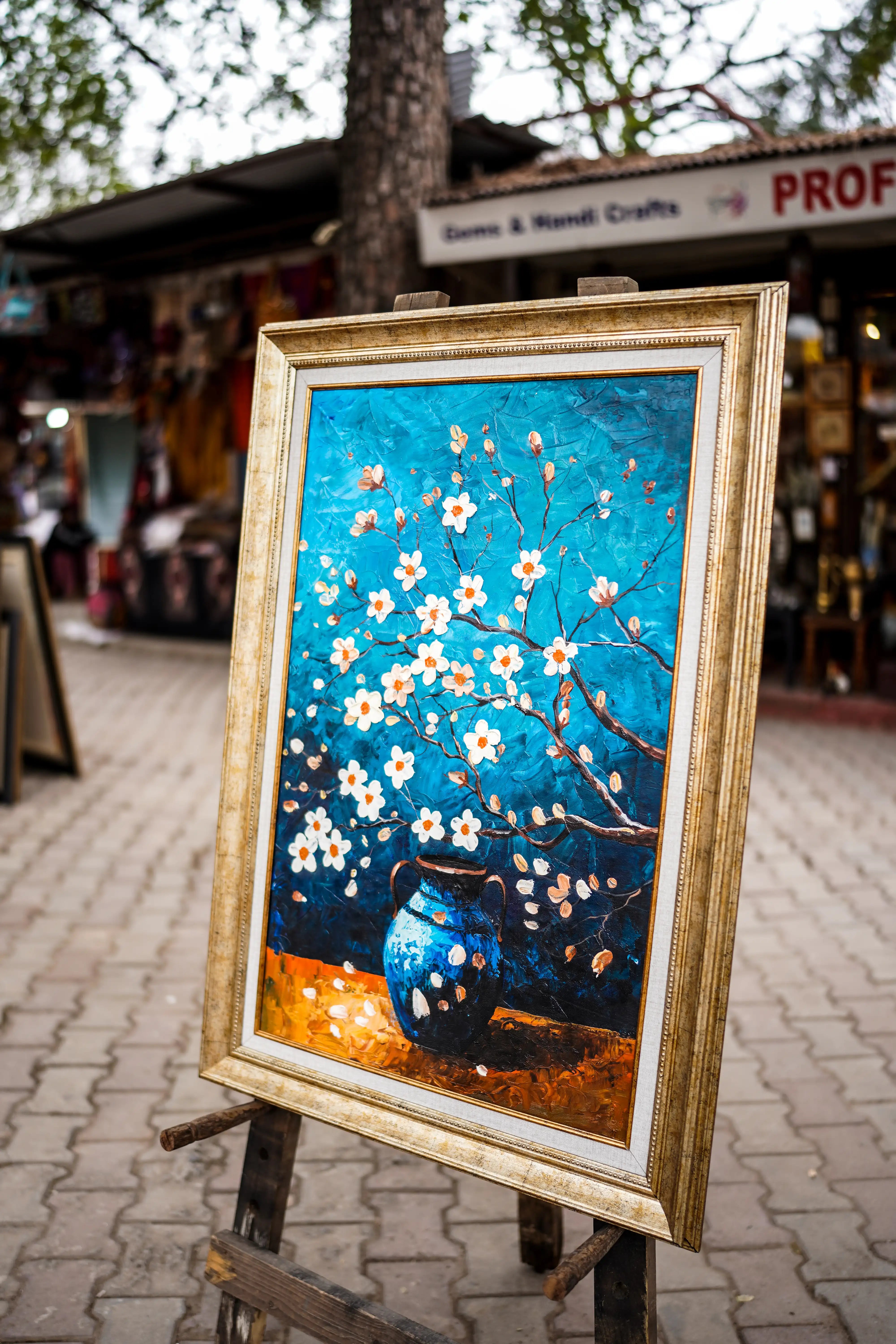 This hand-painted artwork features a beautiful vase with blossoming flowers against a vibrant blue background. The delicate white flowers and the earthy tones of the vase create a striking contrast that brings life and energy to any room. The intricate details of the branches and petals convey a sense of natural elegance, making this painting an ideal choice for nature-inspired decor.